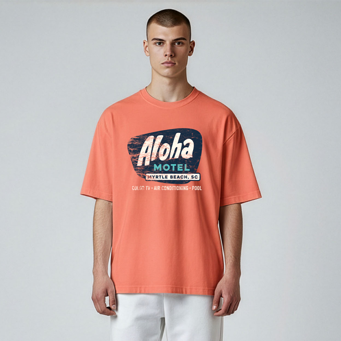 A tribute to the classic era of Myrtle Beach motels that once lined the coastline. The Aloha Motel is long gone but remembered fondly by many. Vintage look with soft distressing.