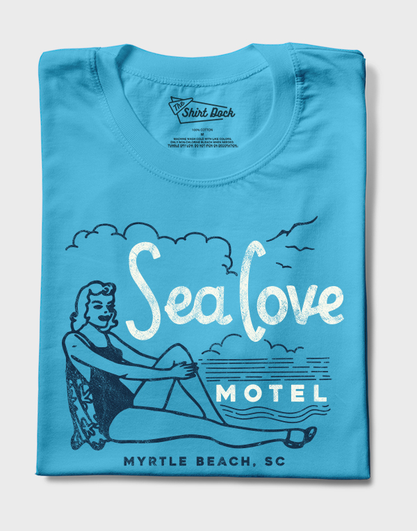 A tribute to the classic era of Myrtle Beach motels that once lined the coastline. The Sea Cove is long gone but remembered fondly by many. Vintage look with soft distressing.