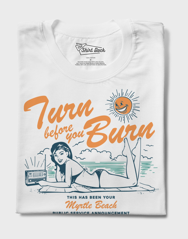 This classic Myrtle Beach radio jingle played every half hour to remind you to ” Turn before you Burn” all summer long! Vintage look.